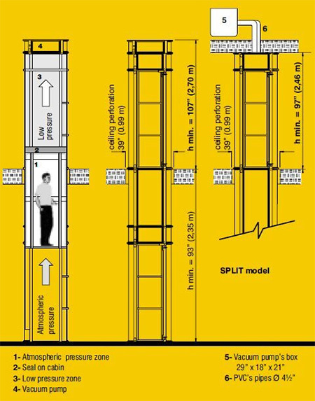 El elevador por vacío de PVE combina un cilindro vertical liso con una cabina coaxial. Se mueve hacia arriba y hacia abajo mediante succión de aire, que es uno de los principios. Los principios de funcionamiento del ascensor funcionan sobre el empuje ascendente. Se genera debido a la diferencia entre la presión atmosférica en la parte superior del automóvil y la presión atmosférica debajo del automóvil. La depresión (vacío) para levantar la cabina se produce mediante turbinas que funcionan como extractores de aire que se encuentran en la parte superior del ascensor.
