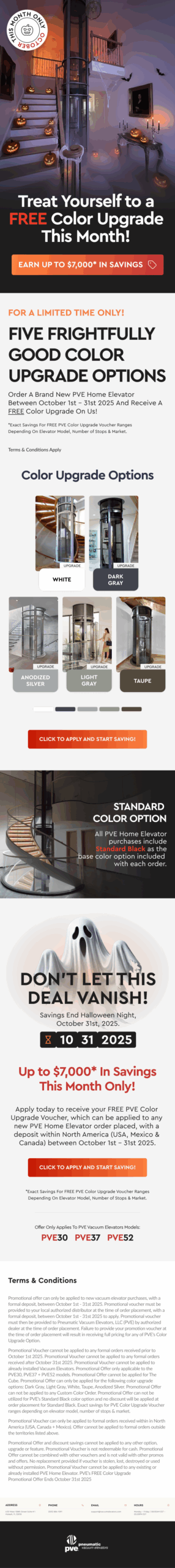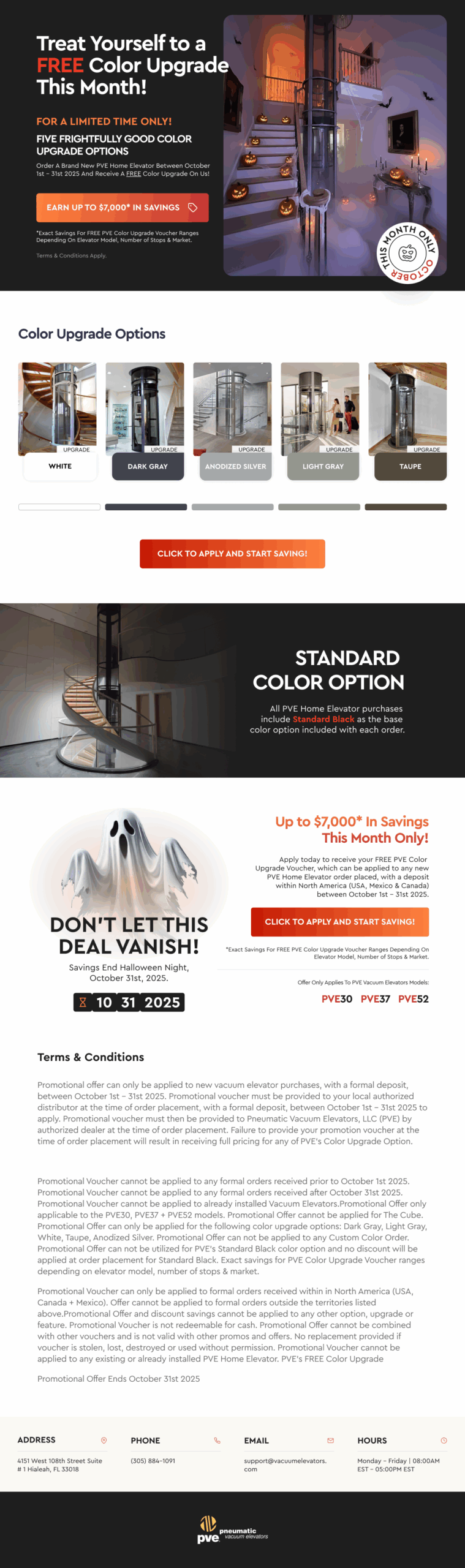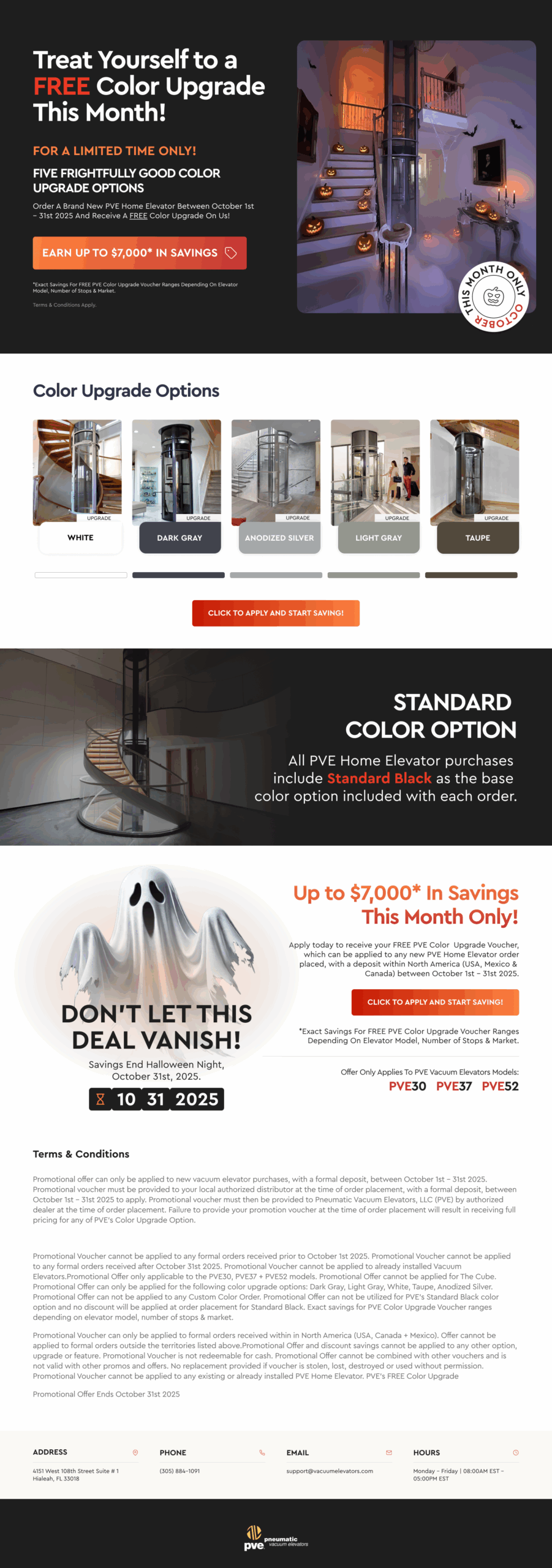 Your FREE Color Upgrade Voucher can be applied to any new PVE Home Elevator order placed, with a deposit within North America (USA, Mexico & Canada) between October 1 and October 31, 2025.
